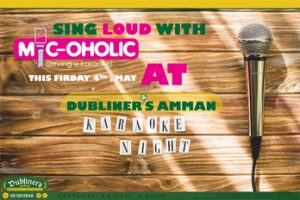 Friday 4-5-2018 9:00 PM Another Special night at Dubliners with the amazing Micoholic Karaoke coming from Lebanon. Karaoke is the life of the party! -Reservations Required -Entrance Fees 5 JOD -For Reservation Please Call (06) 581 2848