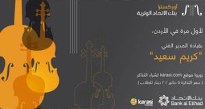 لأول مرة في الأردن، بنك الاتحاد يقدم أوركسترا بنك الاتحاد الوترية بقيادة المدير الفني كريم سعيد في مسرح حليم سلفيتي، بنك الاتحاد - الشيمساني karasi.com لشراء التذاكر زوروا موقع (سعر التذكرة 5 دنانير / 2 دينار للطلاب) For the first time, Bank al Etihad presents Etihad String Orchestra With the special appearance of the Artistic Director Karim Said Buy your e-ticket through karasi.com (Ticket price is 5JOD for adults / 2JOD for students)