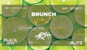 BLITZ Presents Saturday Weekly Brunches lets break the routine with Dj ARSH Open Doors At : 2 PM till 8 PM Entrance : 15 JD + 1 Free Drink 10 JD Only Entrance • For table reservations & more info: • ( 079 771 56 55 ) •Management reserves the right to refuse entry ● Couples & Mixed Groups ● ● Door policy applies. ▪ STRICTLY 21+ ▪ •We are not responsible for any lost items.