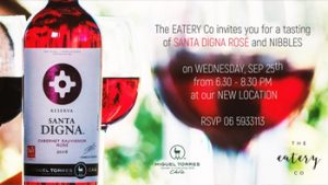 The Eatery Co. invites you for a tasting of SANTA DIGNA ROSÉ and NIBBLES on WEDNESDAY, SEP 25th from 6.30 - 8.30 PM, at our NEW LOCATION RSVP 06 5933113