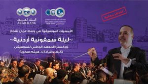 أمسيات مؤسسة عبد الحميد شومان الموسيقية في وسط عمّان تقدم، أمسية موسيقية بعنوان "ليلة سيمفونية أردنية" مع أوركسترا المعهد الوطني للموسيقى، تأليف وقيادة د. هيثم سكرية، وغناء الفنانتين الأردنيتين غادة عباسي ونتالي سمعان. يوم الجمعة 30 آب 2019 الساعة 7:30 مساءً وذلك على مسرح الأوديون بجانب المدرج الروماني -وسط البلد. - أوركسترا المعهد الوطني للموسيقى: ولدت أوركسترا المعهد الوطني للموسيقى عام 1988 من طلبة وأساتذة المعهد الوطني للموسيقى. وتطورت عبر تاريخ المعهد لتصبح أهم أوركسترا في الأردن تقدم البرامج الكلاسيكية …