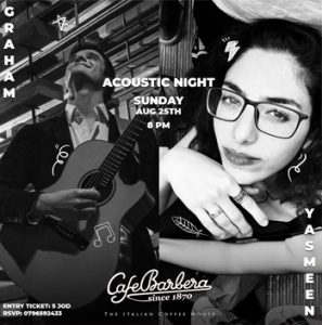 Hey everyone! This is my first gig ever with the amazing Graham on guitar! Join us this Sunday at Cafe Barbera for a chill acoustic set! For reservations call 0796592433 or contact me! Entrance: 5 JD Hope to see you all there!