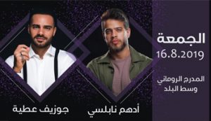 بمناسبة عيد الأضحى المبارك جوزيف عطيه و ادهم نابلسي في حفله من اروع الحفلات يوم الجمعة 16/8/2019 الساعة الثامنة والنصف، على مسرح المدرج الروماني، الساحة الهاشمية، وسط البلد. * سيتم الإعلان عن اماكن توفر التذاكر قريباً! الان يمكنكم شراء التذاكر من www.karasi.com اسعار التذاكر: 15,25,35 (مدرج) و 50 (كراسي) لمزيد من المعلومات، يرجى الاتصال على: 0796112242 0777775468
