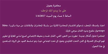 ستكون هذه المحاضرة الثانية من ثلاث محاضرات عامة في المتحف الوطني والتي تأتي ضمن فعاليات ورشة العمل “ميتا سكيب” التي تجمع الآن 14 فنانة وفنان سيعملون بشكل جماعي على إنتاج أعمال فنية لمعرض “ميتا سكيب”، والذي سيتم أفتتاحه في 13 نيسان، 2017
