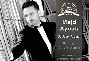 لأول مرة في فندق سانت جون مادبا شاركونا سهرة النجم مجد ايوب و DJ جابر علامات يوم الخميس ١٠/١١/٢٠١٦ الساعة ٨:٣٠ مساءً.