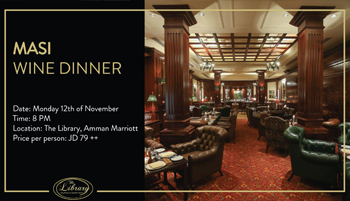 The sommelier Mario Jr. Appiani from Yousef M. Haddad co. & Mr. Marco Zauli from MASI are proud to guide you through an exceptional journey of the finest wines of Masi range, paired with wonderful dishes prepared by Library Lounge & Cigar Bar’s chefs on Monday November 12th from 8PM.