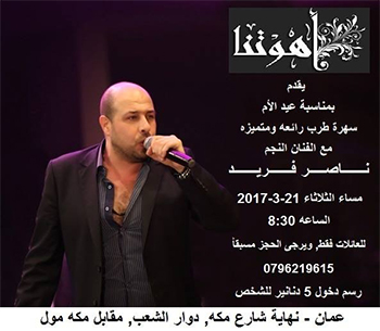 الثلاثاء 21-3-2017, يبدأ الحفل الساعه 8:30 مساءاً