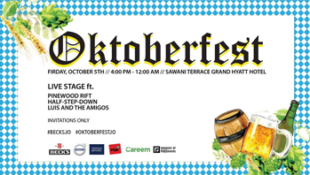Barrels & barrels of fun on Friday Oct. 5th from 4pm-12am at Sawani Outdoors Terrace (BEHIND the Grand Hyatt Amman) featuring a rich lineup of LIVE bands, delicious German food stations, & of course plenty of Beck’s Beer!