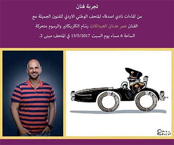 اصدقاء واعضاء المتحف، تجربة فنان من لقاءات نادي اصدقاء المتحف الوطني الاردني للفنون الجميلة مع الفنان عمر عدنان العبداللات رسّام الكاريكاتير والرسوم متحركة الساعة 6 مساء يوم السبت 13/5/2017 في المتحف مبنى 2