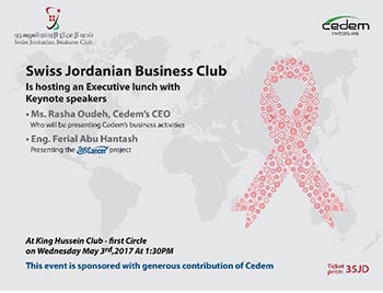 Swiss Jordanian business club & Cedem hosting an executive lunch with keynote speakers Ms. Rasha Oudeh , Cedem CEO who will speak about Cedem business activity and Engineer Ferial Abu Hantash who will be presenting OptiCancer project on Wednesday May 3rd, 2017 at 1:30PM at King Hussein Club . Ticket price JD35