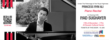 Under the Patronage of Her Royal Highness Princess Rym Ali, pianist Iyad Sughayer will give a piano recital on Saturday the 17th of December at Al Hussein Cultural Center. The concert will start at 7 pm.