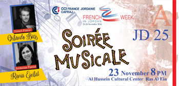 Under the patronage of Their Royal Highnesses Prince Ra’ad and Princess Majda, CAFRAJ and the Friends of Jordan Festivals are organizing a Piano concert by renowned French pianist Orlando Bass alongside Jordanian pianist Rania Ejelat at Al Hussein Culture Center.