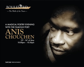 Enjoy the rhymes of a magical poetry night performed live At The Bouelvard by the talented poet Anis Chouchen! Join us on the 15th-16th of May, 10:00 pm- 10:30 pm and 11:00 pm-11:30 pm.