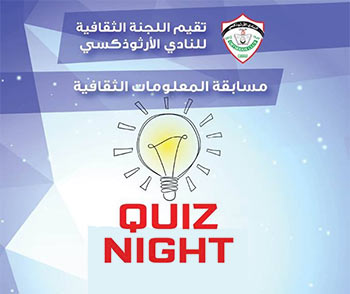 تقيم اللجنة الثقافية للنادي الارثوذكسي مسابقة المعلومات الثقافية وتشمل وجبة عشاء خفيف وجوائز يوم السبت 26/11/2016 الساعة السابعة والنصف مساء في قاعة وهبة تماري
