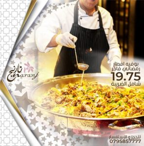 فقط ب 19.750 دينار شامل الضريبة بوفيه افطار شامي من المطبخ السوري الأصيل، محُضر خصيصاً للشهر الفضيل للحجز و الأستفسار: 0795857777