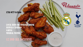 Join us at Parlamento on the 17th of October at 9:45pm to watch the match between Real Madrid and Tottenham Hotspur! Naffas, Buffalo tenders, Local Beer or Cocktail Drinks all for only 12JOD inclusive.