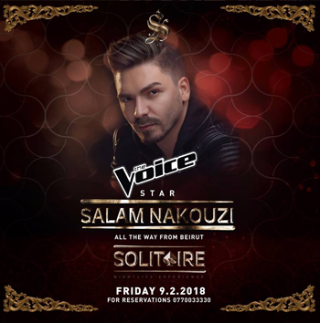This Friday, All the way from Lebanon , Salam Nakouzi THE VOICE Super Star Solitaire – Nightlife Experience , For reservations please call 0770033330