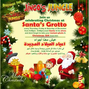 Santa's Grotto @ Jingo's Jungle Every Thursday, Friday & Saturday of December 2016 from 5:00pm till 8:00pm Meet Santa & his elves and dont forget to take your instant photo Christmas gift from him Discover Fun in the largest indoor Family Entertainment Center in Jordan Jingo's Jungle, City mall-3rd floor 065823700 اكتشف المرح في أكبرمدينة ألعاب مغلقه في الاردن جنغوز جنغل، سيتي مول - الطابق الثالث 065823700
