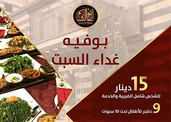 بنستناكم يوم السبت مع بوفية غذاء السبت المميز فقط ب١٥دينار للكبار و ٩ دنانير للاطفال من الساعه ٢حتى الساعه ٥:٣٠مساءً