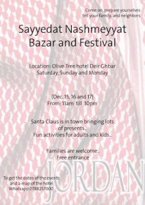 استنونا ب بازار و مهرجان سيدات نشميات الرابع / بازار الكريسماس ( بازار الكريسماس و رأس السنة ) البازار سيكون ل ثلاثة أيام السبت و الأحد و الإثنين ١٥ و ١٦ و ١٧ من شهر ١٢ لعام ٢٠١٨ من الساعة ١١ صباحا و لغاية ١٠ مساءا في فندق الزيتونة (Olive Tree Hotel )