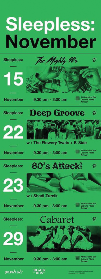 This November , we invite you to join our “SLEEPLESS” event series taking place at Black Iris – Crowne Plaza Amman. This time we are bringing you events with music for everyone starting with this Thursday: