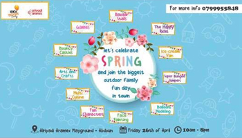 Let’s celebrate spring , and join the biggest outdoor fun family fun day in town , come enjoy our games , The Happy Rides , Bouncy Castles , Arts and Crafts , Food and Drinks , face Painting , Balloons Modeling , Fun Characters , Bazaar Stalls , Ice Cream Van , Gifts , Prizes and Much Much more .
