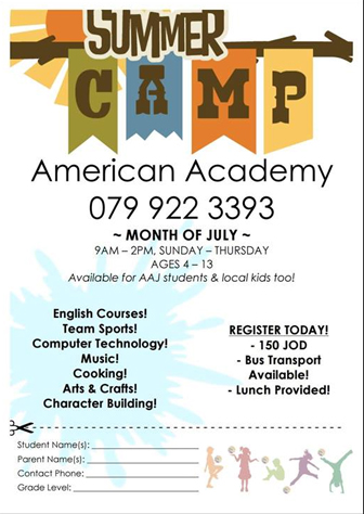 طوال شهر تموز من الأحد للخميس من الساعة 9 إلى 2 يبدأ من عمر 4 إلى 13 سنة, الاشتراك 150 دينار, كما يتوفر خدمة الباصات ووجبة طعام.