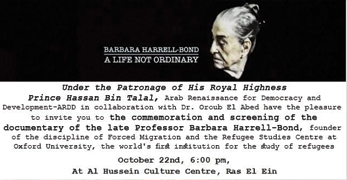 Under the Patronage of His Royal Highness Prince Hassan Bin Talal, Arab Renaissance for Democracy and Development-ARDD in collaboration with Dr. Oroub El Abed have the pleasure to invite you to the commemoration of the late Professor Barbara Harrell–Bond (BHB), the founder of the discipline of Forced Migration and the Refugee Studies Centre at Oxford University, the world’s first institution for the study of refugees.