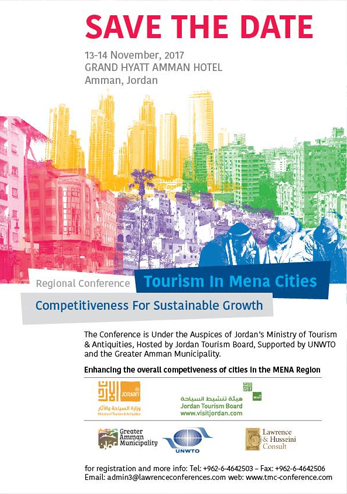 Under the auspices of the Jordanian Ministry of Tourism and Antiquities, the Jordan Tourism Board (JTB) is organizing a Regional Conference on Tourism in MENA Cities: Competitiveness for Sustainable Growth in Amman, on 13 and 14 November 2017, in collaboration with the Greater Amman Municipality (GAM) and Lawrence & Husseini Consult and with the technical support of the World Tourism Organization (UNWTO).