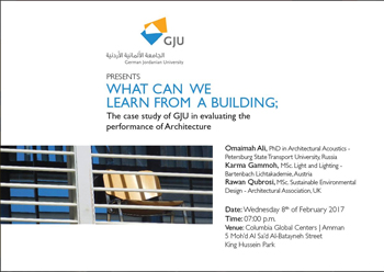 This presentation will draw attention to the building’s interaction with its surroundings and its users. The German Jordanian University in Madaba was taken as a case study to analyze, evaluate and better understand the performance of an educational building through quantitative and qualitative studies.