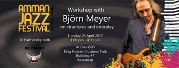 Amman Jazz Festival in partnership with Feesheh Music Warehouse | فيشه: مستودع الموسيقى is organizing a workshop with Björn Meyer on structures and interplay, onTuesday the 25th of April. from 1:00 p.m to 4:00 p.m (including a coffee break) at Osis500 – King Hussein Business Park. Bring your instrument and join us!