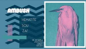 Ambush is a night happening every FRIDAY at Zorba Downtown. Lineup: Hematite SOU Zai' Location: Zorba Downtown Entrance: 10JDs NO VISA (Cash only) Doors open: 9:00PM Couples & mixed groups *Valet parking is available More info: 0796216316