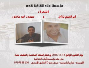 لقاء مختلف يجمع كل من : الشاعر ابراهيم نزال و الشاعر محمود أبو عاشور و ذلك يوم الاثنين الموافق 14/11/2016 في تمام الساعة السادسة و النصف في مقر مؤسسة أوتاد الثقافية اللويبدة - دوار باريس - شارع الباعونية - مبنى رقم 15 الطابق الارضي للاستفسار 0797888100 ادارة أوتاد