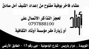 عشاء فاخر من إعداد الشيف أمل صادق @ أوتاد للثقافة و التراث و الفنون On Saturday 24/12/2016 - at 7 PM - 9 PM عشاء فاخر من إعداد الشيف أمل صادق في أجواء عائلية جميلة ، يفتح البوفية بين الساعة السابعة و السابعة و النصف مساء سعر التذكرة للشخص الواحد 5 دنانير لحجز التذاكر الرجاء الاتصال على الرقم التالي 0797888100 أو شراء التذكرة من مقر مؤسسة أوتاد الثقافية في اللويبدة عدد التذاكر محدود أخر موعد للحجز والدفع يوم الخميس 22/12 …