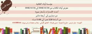 معرض أوتاد للكتاب 20/12/2016 إلى 25/12/2016 من الساعة 3:30 عصرا إلى 11:00 مساء إصدارات مميزة و أسعار رمزية مميزة من دينارين إلى أربعة دنانير ريع المعرض يذهب لدعم أنشطة المؤسسة . اللويبدة - دوار باريس - شارع الباعونية - مبنى رقم 15 - الطابق الأرضي 0797888100