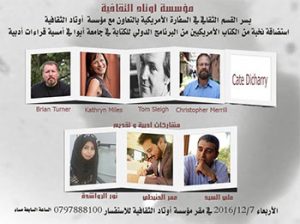 قراءات أدبية | البرنامج الدولي للكتابة في جامعة أيوا @ أوتاد للثقافة و التراث و الفنون On Wednesday 7/12/2016 - 7:00pm يسر القسم الثقافي في السفارة الأمريكية بالتعاون مع مؤسسة أوتاد الثقاقية استضاقة نخبة من الكتاب الأمريكيين من البرنامج الدولي للكتابة في جامعة أيوا في أمسية قراءات أدبية الأربعاء 7/12/2016 الساعة السابعة مساء في مقر مؤسسة أوتاد الثقافية 0797888100