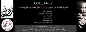 مجموعة نقش الثقافية تستمر في فعالياتها ضمن مشروع سهرة تجلي تدعوكم لحضور سهرة تجلي وبمشاركة: أحمد شاهين - غناء جهاد سويدات - عزف عود الشاعر بهاء سيوف فرقة ورد المسرحية وداعاً محمود عبدالعزيز ويقدم الحفل الشاب محمود الرشايدة وذلك يوم الجمعة 30/12/2016 الساعة 7:30 مساء في أوتاد الثقافية جبل اللويبدة شارع الباعونية بجانب مطعم راس بيروت.