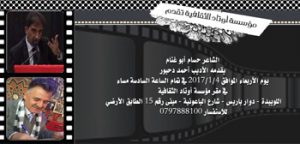 تستضيف مؤسسة أوتاد الثقافية الشاعر الفلسطيني حسام أبو غنام في أمسية شعرية يقدمها الأديب أحمد دحبور و ذلك يوم الأربعاء الموافق 4/1/2017 في مقر المؤسسة الكائن في جبل اللويبدة - دوار باريس - شارع الباعونية - مبنى رقم 15 الطابق الأرضي في تمام الساعة السادسة مساء و الدعوة عامة للاستفسار 0797888100