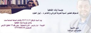 مؤسسة أوتاد الثقافية تستضيف الشاعر والروائي د.أيمن العتوم في أمسية شعرية وذلك يوم السبت الموافق 21/1/2017 في تمام الساعة السادسة مساء في مقر المؤسسة الكائن في جبل اللويبدة - دوار باريس - شارع الباعونية - مبنى رقم 15 الطابق الأرضي تدير الأمسية الشاعرة نور الرواشدة للاستفسار 0797888100