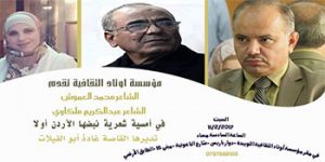 أمسية شعرية للشعراء محمد العموش و عبدالكريم ملكاوي @ أوتاد للثقافة و التراث و الفنون السبت 11/2/2017 الساعة السادسة مساء مؤسسة أوتاد الثقافية تقدم : الشعراء : محمد العموش وعبدالكريم ملكاوي في أمسية شعرية نبضها الأردن أولا تديرها القاصة : غادة أبو الفيلات السبت 11/2/2017 الساعة السادسة مساء في مقر مؤسسة أوتاد الثقافية اللويبدة - دوار باريس - شارع الباعونية - مبنى 15 الطابق الأرضي للاستفسار : 0797888100 الدعوة عامة