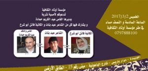 مؤسسة أوتاد الثقافية تقدم الشعراء : عاطف الحجاج و راتب القرشي و سعيد حسونة الأربعاء 17/5/2017 الساعة السابعة مساءً