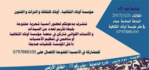 أمسية شعرية مفتوحة و تكريم لباقة من الزهور @ أوتاد للثقافة و التراث و الفنون لأن الأمومة عطاء تتشرف مؤسسة أوتاد الثقافية بدعوتكم لحضور أمسية شعرية مفتوحة تكرم خلالها مجموعة من السيدات و الأنسات و ذلك بمناسبة عيد الأم و وبمناسبة أن كل يوم لكل امرأة هو عيد و تم اختيار الأسماء المكرمة على الأسس التالية - سيدات داعمات لأوتاد .. - سيدات شاركن في فعاليات مؤسسة أوتاد الثقافية الخاصة .. - سيدات شاركن في تنظيم فعاليات لملتقيات صديقة داخل …