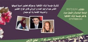 تستضيف مؤسسة أوتاد الثقافية الشعراء : يوسف الديك ، علي السيد ، ناصر قواسمي في أمسية شعرية يوم الأربعاء 15/3/2017 الساعة السادسة و النصف مساء في مقر المؤسسة ، اللويبدة - دوار باريس - شارع الباعونية - مبنى رقم15 - الطابق الأرضي للاستفسار : 0797888100 الدعوة عامة