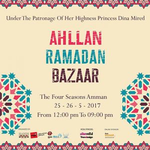 Ahllan Ramadan Bazaar @ Four Seasons Hotel On May 25th & May 26th, 2017 تحت رعاية سمو الاميرة دينا مرعد حفظها الله نتشرف بدعوتكم لمعرض اهلا رمضان المقام في فندق الفورسيزن من ٢٥- ٢٦ /٥/ ٢٠١٧ من الساعة ١٢-٩ مساء شاركونا الاحتفال بقدوم الشهر الفضيل حيث كل ما يلزمكم من الازياء والاكسسوارات الرمضانية وديكورات رمضان والحلويات المختصة بالشهر المبارك كل عام وانتم بألف خير وصحة وسلام