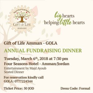Come and join us at our Annual Fundraising Dinner on Tuesday, March 6th at the Four Seasons Hotel, to help save the lives of many more kids with congenital heart disease in Jordan! Our special guests Riley Heart Team led by Dr. Mark Turrentine and Gift of Life International CEO Rob Raylman will be joining us too. Many thanks to your continuous support to make many successful stories and help us do more! For reservations kindly call : 0777224344 Or …