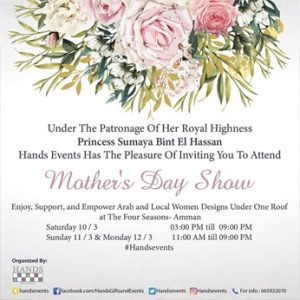 On the occasion of Mothers Day and International Women Day Hands Gifts and Events Present The 17th Annual Mothers Day show It is the first of its kind in Jordan since 2000; It will host the major, creative and innovative designers from Jordan Egypt Iraq Lebanon and Morocco creating fashion accessories home decor furniture, beauty organic product, and more. The exhibition will include inspirational success stories beauty lounge as well with tea time and entertainment for women and family . …
