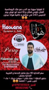 لا تفوتوا سهرة عيد الحب مع ملك الرومانسية الفنان طوني قطان و DJ احمد ابو غوش و ذلك يوم الخميس 14/2/2019 في مطعم و كافية هوانا عبدون سعر التذكرة 40 دينار شامل الخدمة و الضريبة التذكرة بتشمل : حضور الحفلة + عشاء فاخر + سوفت درينك + ماء + أطيب نفس + sweet للعائلات و كبلز فقط يلا منشن أصحابكم و احجزوا شو بتستنوا !!!! تبدأ الحفلة الساعة 8 مساءً الى ساعة 12 مساءً #happy_Valentine’s_Day للحجز والاستفسار : 0797333319 او …