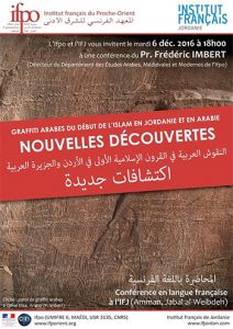 Conférence IFPO "Graffiti arabes du début de l'islam" @ Institut Français de Jordanie Tuesday, December 6 at 6 PM - 7 PM Mardi 6 décembre à 18h En français à l'Institut français L'Institut français du Proche Orient organise une conférence sur le thème des graffiti arabes du début de l'Islam en Jordanie et en Arabie, présentée par Frédéric Imbert, Directeur du Département des Etudes Arabes, Médiévales et Modernes de l'IFPO. Les prospections épigraphiques menées dans les zones désertiques et steppiques …
