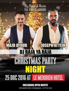 Christmas Party: Joseph Atien & Majb Ayoub @ Le Meridien Amman Sunday, December 25, 2016 - at 8 PM - 2 AM We Are Proud To Annouce Our Upcoming Extraordinary Christmas Party on the 25th Of December 2016 At Le Meridian Hotel Amman Preformed By Our Stars : JOSEPH ATTIEH & MAJD AYOUB Accompanied with One Of The Best DJ's In Town RAJA YA RAJA . Part OF The Proceeds Gained From The Concert Will Go Toward Fuhais Lions Clinic …