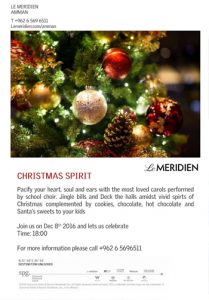 Christmas Spirit @ Le Meridien Hotel Amman Pacify your heart, soul and ears with the most loved carols performed by school choir. Jingle bells and Deck the halls amidst vivid spirts of Christmas complemented by cookies, chocolate, hot chocolate and Santa's sweets to your kids Join us on Dec 8th 2016 and let us celebrate Time: 18:00 For more information please call +96265696511